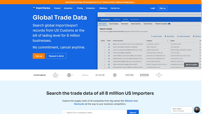 ImportGenius is a trade intelligence platform that provides global shipping data, allowing exporters and international traders to access detailed import and export records.