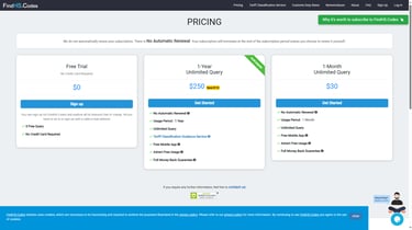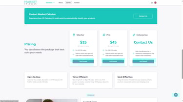 Pricing starts at $15 for 25 HS codes, with a Pro Plan available at $45 for 150 codes. Enterprise solutions are also offered for bulk classification, with custom pricing based on business needs.