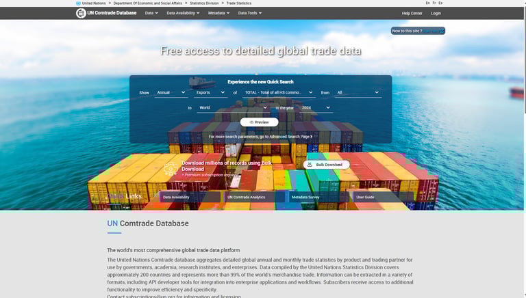 Comtrade is a global trade database by the United Nations, providing detailed import and export data from countries worldwide.