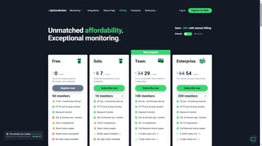 A free plan allows monitoring of up to 50 websites every 5 minutes, while paid plans with faster checks and advanced features start at $7 per month.